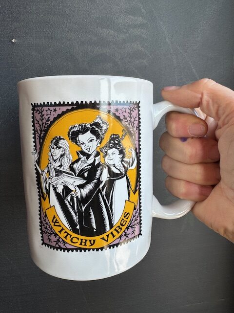 The Hocus Pocus Witchy Vibes Mug makes a great gift for fans of the three Sanderson sisters. Featuring them in a cartoon stylized version, this mug holds 11 oz. of your favourite Cupper’s coffee. The back of the mug displays the phrase made famous by Sarah Sanderson – Amuck Amuck, Amuck!