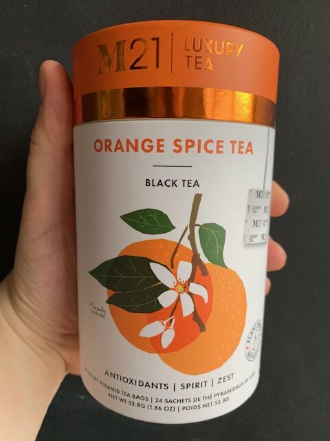 M21 Orange Spice Tea is part of the M21 Luxury line of teas. Made in Canada by the Metropolitan Tea Company, this tea is small-batch blended and packed for the best flavour. Each tea is packaged in 100% plant-based, compostable pyramid tea bags. In addition, all of the M21 teas are Kosher and Vegan certified and are packed in a modified atmosphere to ensure a long shelf life. The beautiful ‘tins’ are made of 100% paper, and each can holds 24 tea bags. Purchase several cans together for a lovely hostess gift, or treat yourself. After all, you deserve it, too!