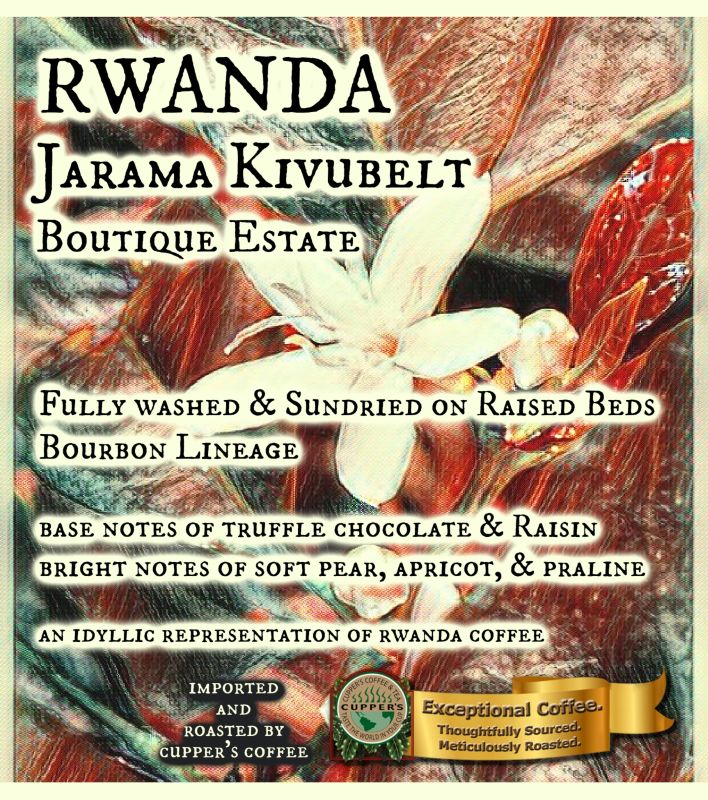 Rwanda Jarama Kivubelt Estate Medium Roast Coffee is our February 2026 offering of one-time, unusual coffees. This amazing coffee excites us to cup it for the first time! The green coffee comes from the Bourbon linage of coffee, produced on Kivu Belt’s private farm. Employing hundreds of local skilled labourers to harvest, the processing happens at their Jarama washing station.