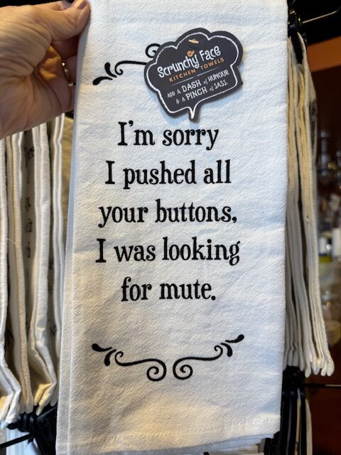 Scrunchy Face doesn’t take life too seriously. One look at their flour sack tea towels and you have no choice but to agree. As with this towel – “I’m sorry I pushed all your buttons. I was looking for mute.” With funny quips and far-too-accurate zingers, you’ll find a towel here perfect for any kitchen.