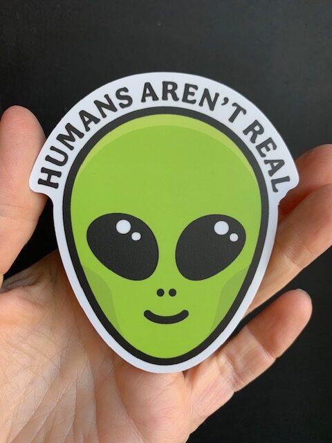The Humans Aren’t Real sticker from Stickers Northwest is a perfect example of a great product. All their stickers are super-durable, stand up to wear and weather and are very easy to apply. They don’t warp or buckle from sun, rain or dishwasher and are remarkably fade resistant. We’ve even had reports from customers that they peel off well and leave a minimum of residue behind when you’ve had them on your vehicle for a while. With the wide variety to choose from, they are just as sassy, silly, elegant or relaxed as you! Put your Humans Aren’t Real sticker on your water bottle, your kayak, your bike, your laptop, or your car. Basically, they’re good for wherever you want to personalize your life.